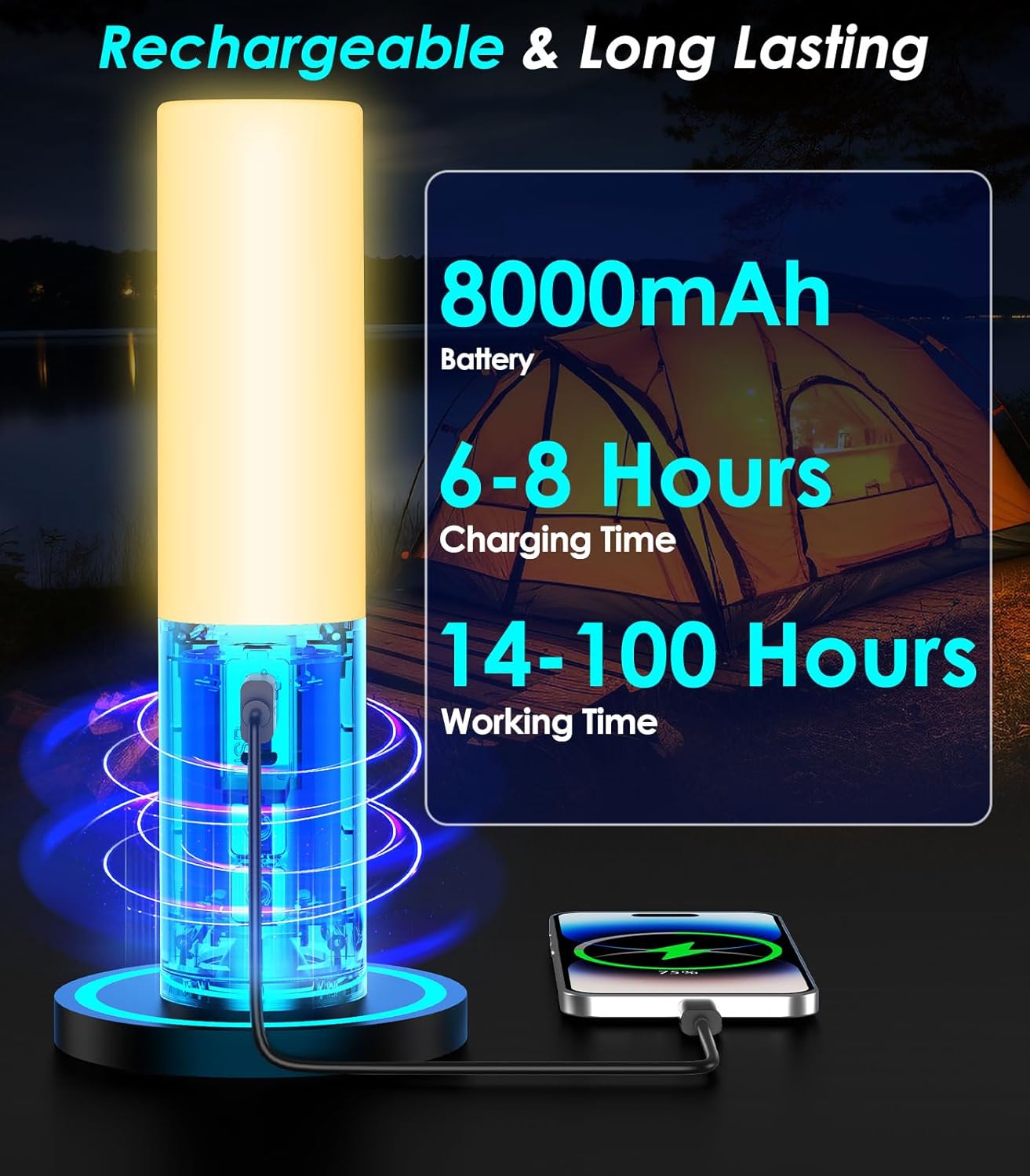 USB RECHARGEABLE and 8000mAh LARGE CAPACITY POWER BANK: The rechargeable camping lantern is equipped with a built-in 8000mAh rechargeable battery, which can be recharged via the included charging cable. The camping string lights can work 20-40H after a full charge, you can use it with confidence in darkness or power outages. It also can serve as a power supply for smartphones or other devices in an emergency.