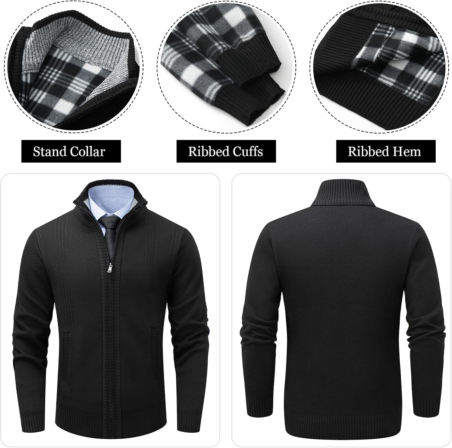Men’s cardigan sweater is designed with stand collar, 2 side pockets and zipper closure, classic and fashionable design for fall and winter.
