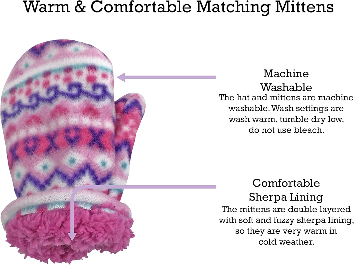 Warm and comfortable sherpa lining in hat and mittensHook and loop chin strap on hat for a secure fitElastic in the mitten wrists for easy-on wearMany fun colors and embroideries to choose from
