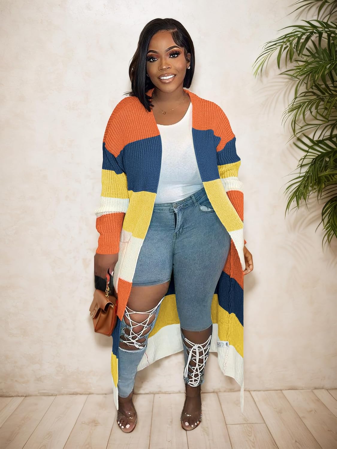 Nimsruc Long Cardigan Sweaters for Women Patchwork Open Front Knit Sweater