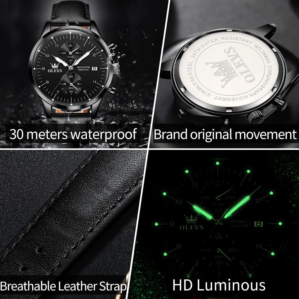 OLEVS Leather Watches for Men Fashion Watch Men Chronograph Waterproof Wristwatch Stainless Steel Quartz Easy Read Men’s Watch Business Dress Mens Casual Watches [Black/White/Blue Dial]