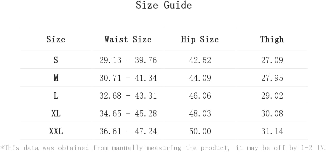 XXL:Hip Size:50.0IN,Thigh:31.1IN,Waist Size:36.6-47.2IN