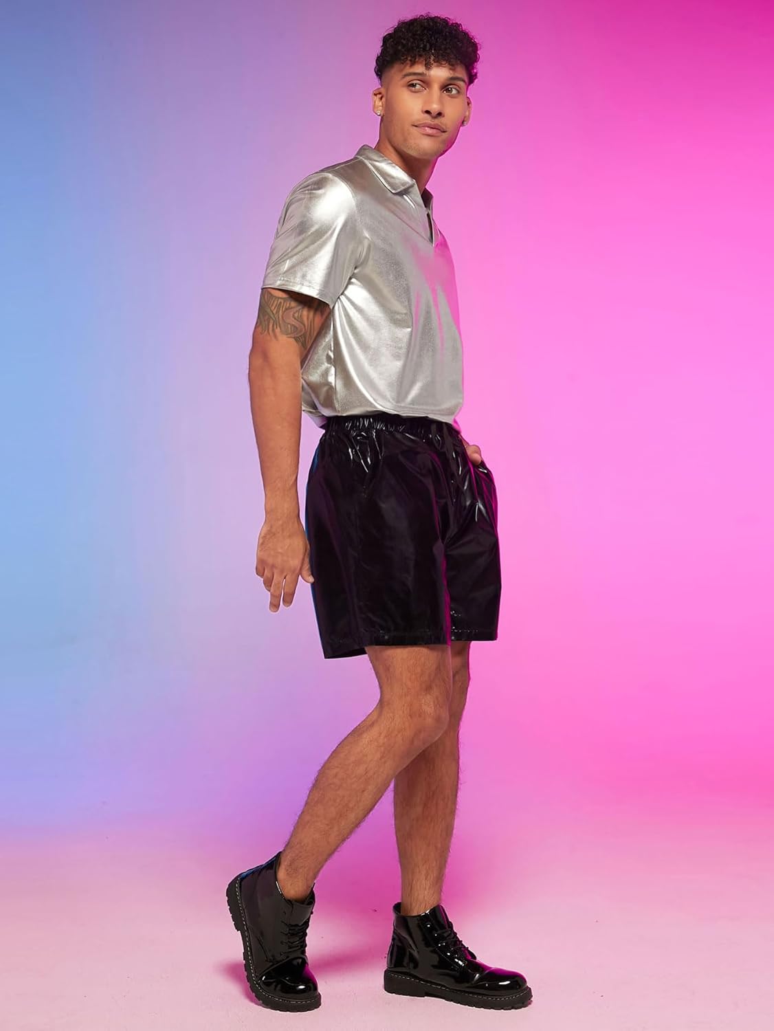 OYOANGLE Men’s PU Leather Elastic Waist Shorts Party Clubwear Rave Shorts with Pocket