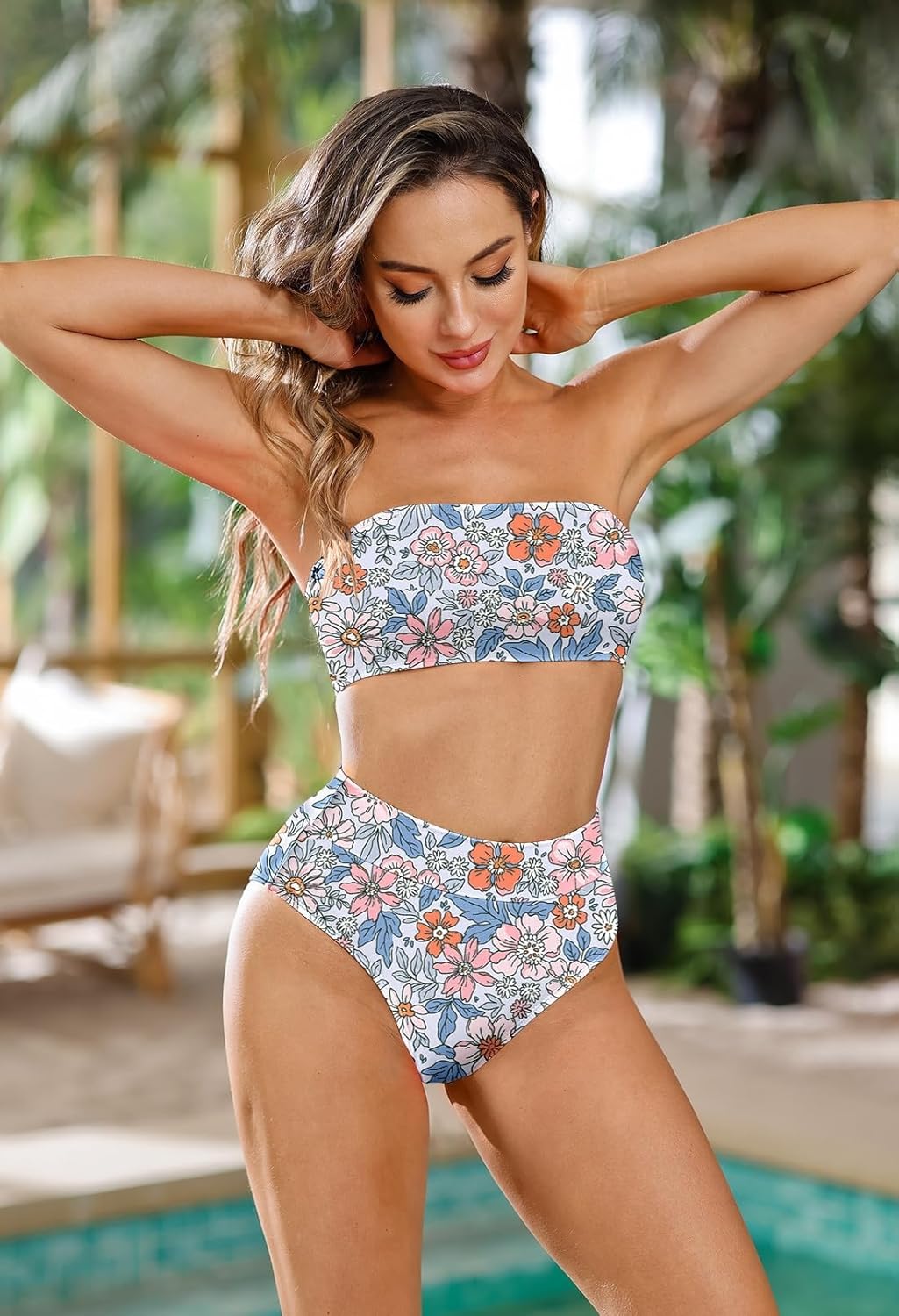 Bandeau Bikini Top: Removable shoulder straps, removable padded, push up, hold big breasts wellHigh Waisted Bikini Bottom: High leg high cut swimsuit, cheeky bathing suit, elastic waistband and tummy control swimwearOccasions: Summer beach, swimming pool, vacation, party, Miami trips, snorkeling