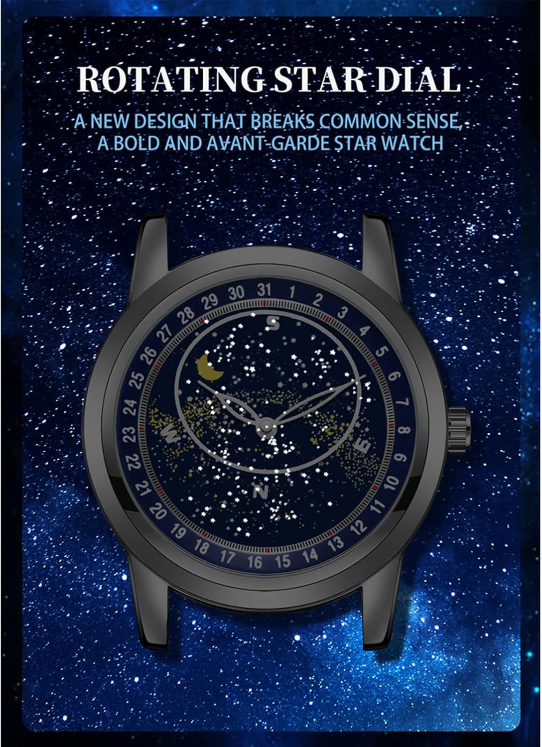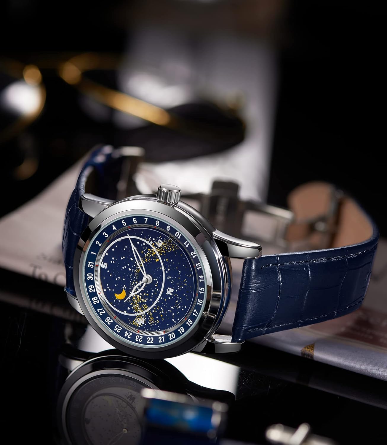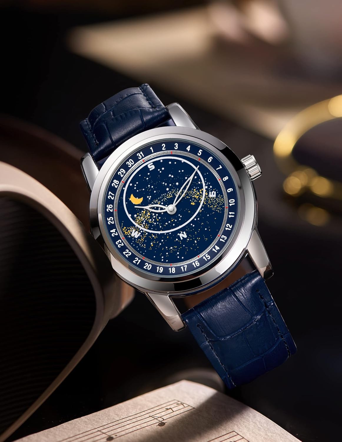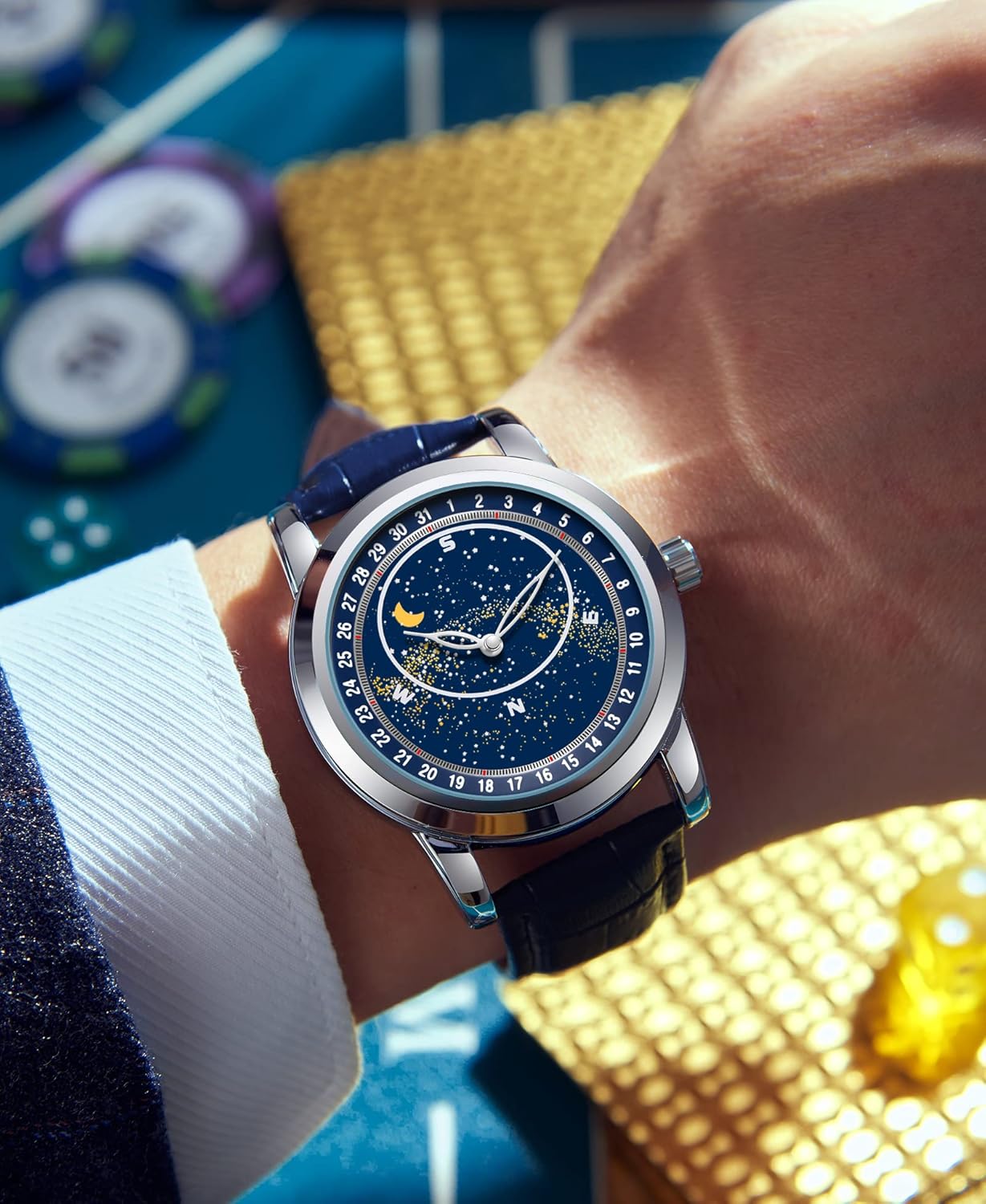 PINTIME Mens Fashion Leather Watch Luxury Dress Starry Sky Luminous Waterproof Quartz Analog Wristwatch for Men
