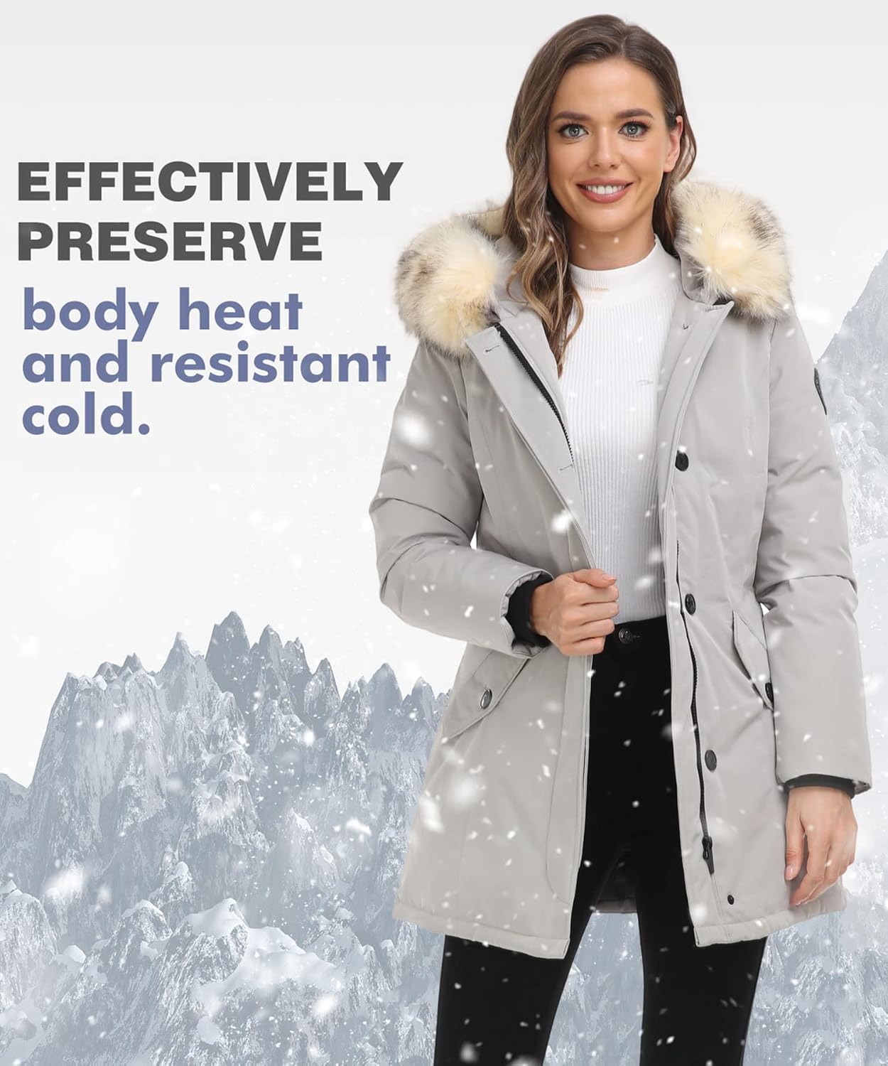 PUREMSX Duck Down Winter Coat for Women Insulated Long Thick Fur Hood Puffer Warm Parka Jacket