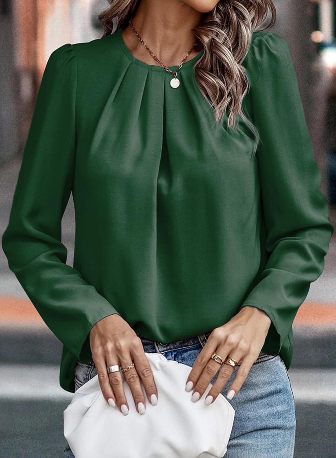 Samefar Womens Tops Dressy Casual Pleated Crew Neck Long Sleeve Shirts Office Work Chiffon Blouses