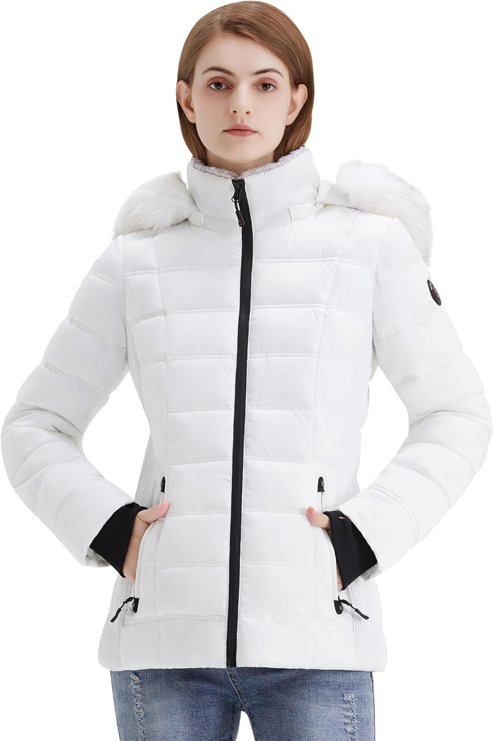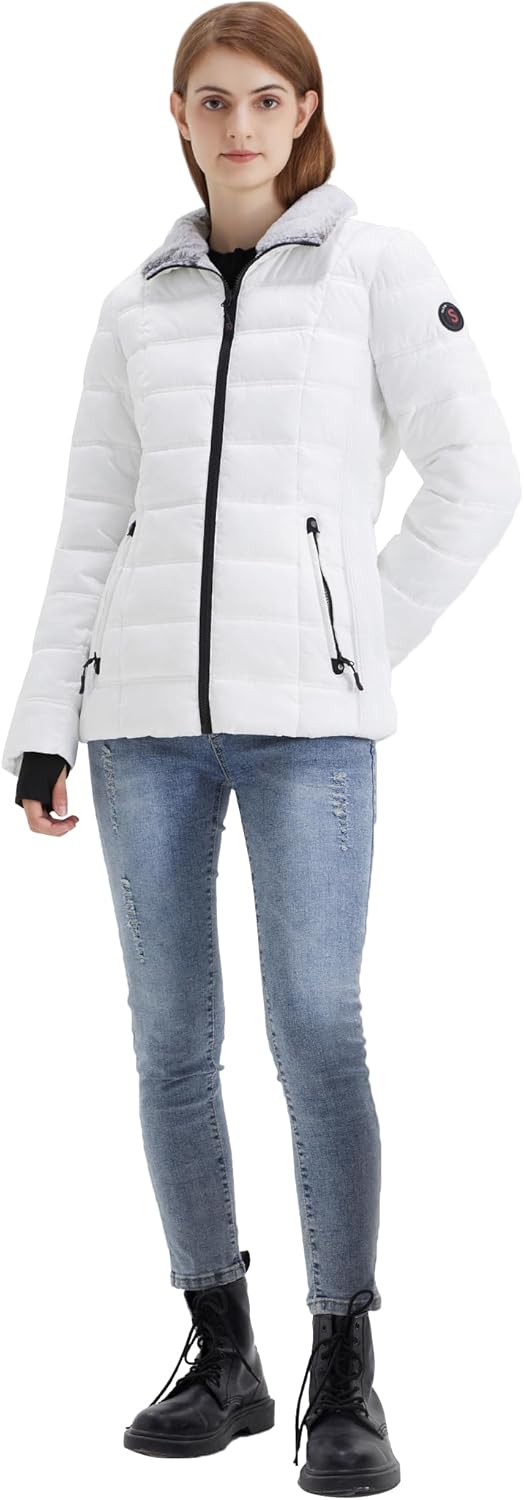 SLOWTOWN Women’s Puffer Jacket Warm Hooded Winter Puffy Jacket with Faux-Fur Trim and Collar