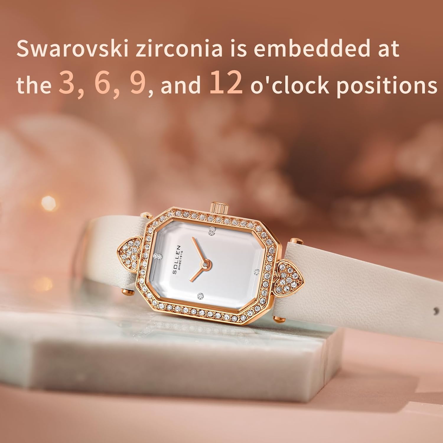 As a brand dedicated to high-quality watches, SOLLEN ensures that every design undergoes multiple revisions and meticulous refinement.This square white women’s watch features a dial with a diameter of 20*26mm and a thickness of only 7mm. It has a water resistance of up to 100 ft, suitable for everyday use.The outer bezel is adorned with a circle of zircon stones, while the 3, 6, 9, and 12 o’clock positions on the dial are set with Swarovski zirconia, adding a touch of intricate elegance.