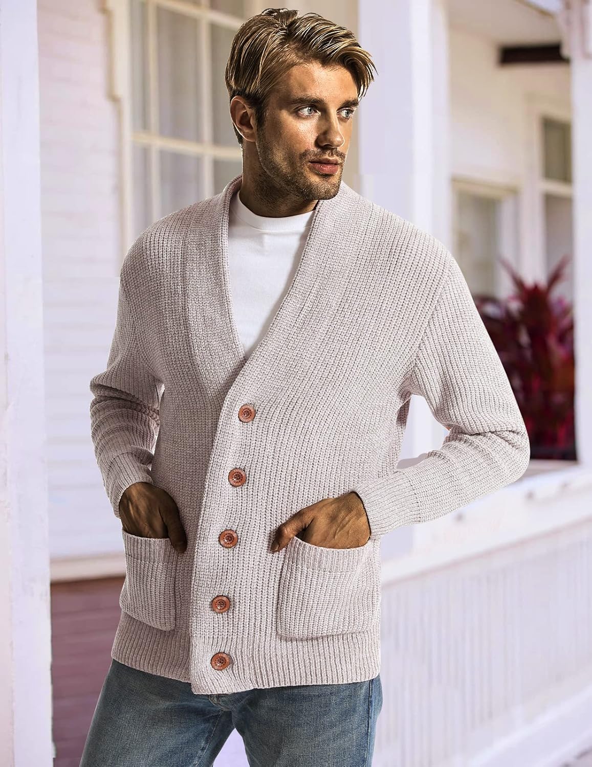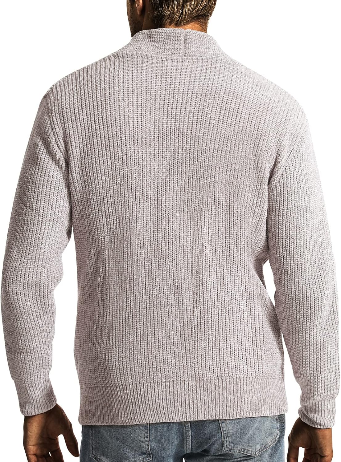 Surenow Mens Shawl Collar Cardigan Sweater Cable Knit Buttons Casual Sweater Fleece Long-Sleeve Chenille Sweater with Pockets