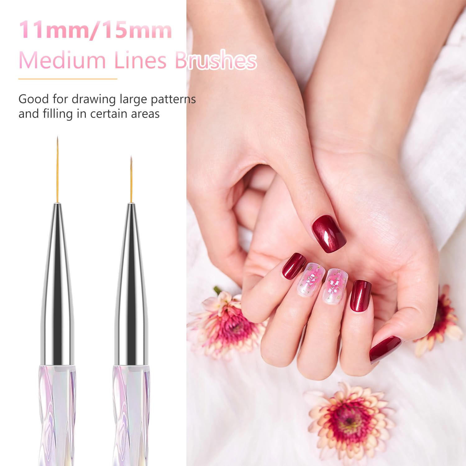TEOYALL Nail Art Liner Brushes, Fine Line Nail Brush 7/9/11/15/20mm Thin Detail Precision Drawing Brushes for Gel Nail Polish