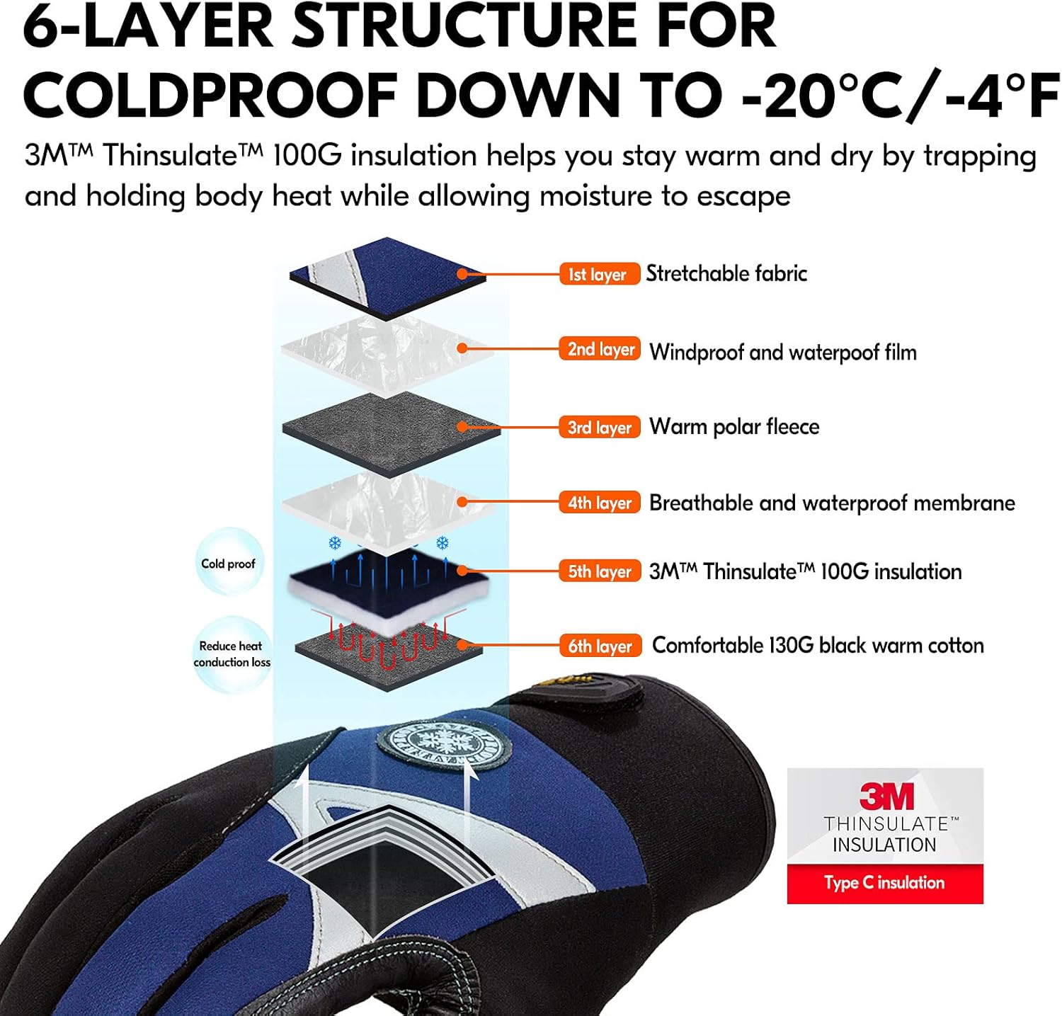 COLDPROOF & WATERPROOF – 6-layer structure for coldproof down to -20℃/-4°F. The TPU waterproof lining along with the 3M Thinsulate insulation C100 lining to ensure our gloves to keep your hands warm. HIGH DURABILITY AND ABRASION RESISTANCE – Synthetic leather palm offers long-lasting durability, with higher durable PVC patched on key palm areas to add extra protection and resistance to wear REFLECTIVE STRIPS- on the back for high visibility ensures safety during working TOUCHSCREEN COMPATIBLE – The Unique and Practical 3 Touchscreen Capability design(thumb, forefinger, middle finger,) that assures you won’t have to remove the gloves to use your phone