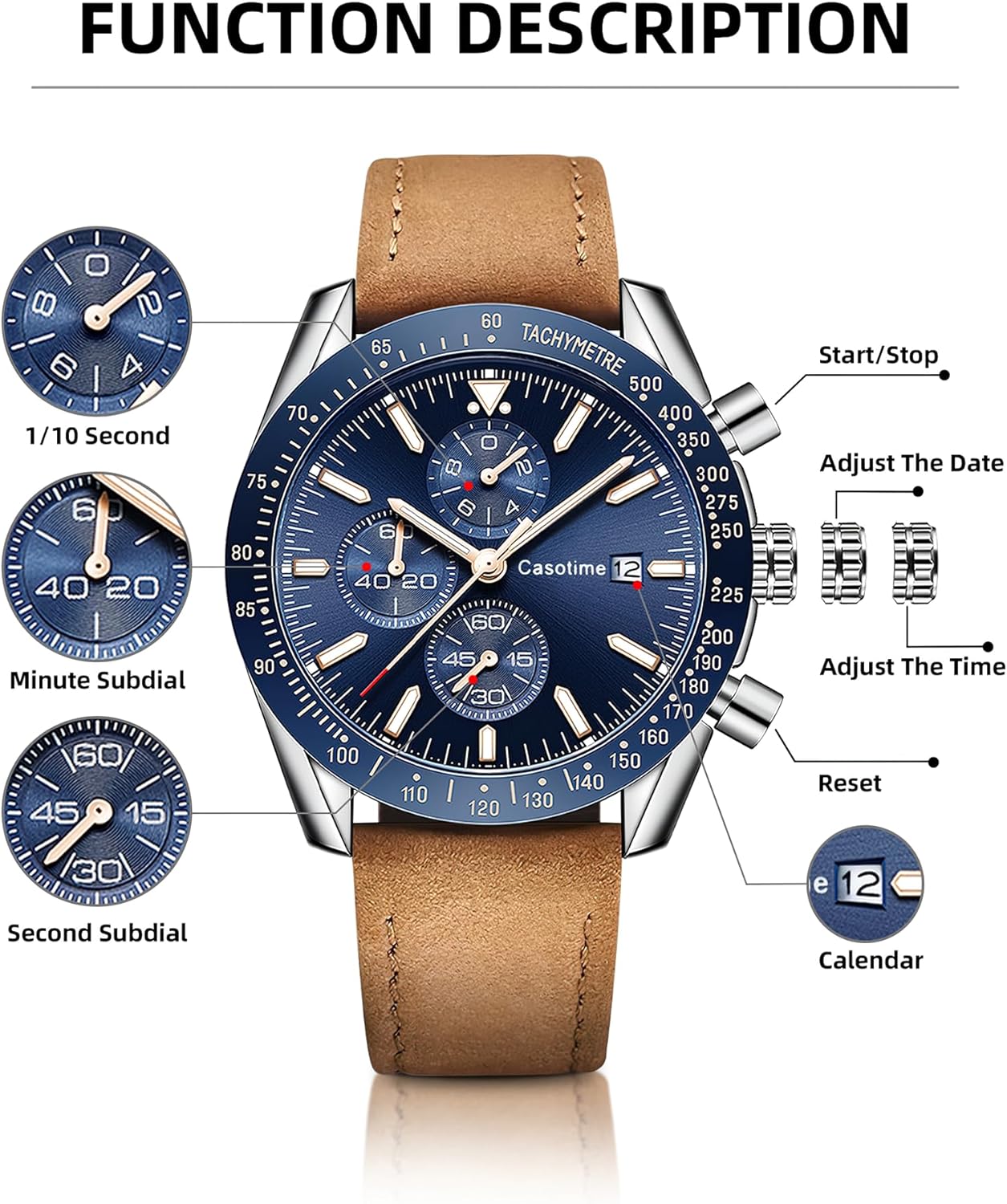 1.This is a men’s chronograph watch, a brown leather strap, a silver stainless steel case, and a blue dial that make it fashionable.