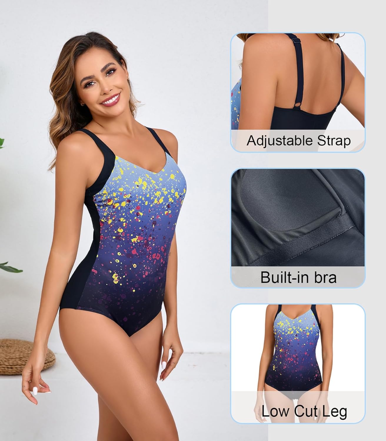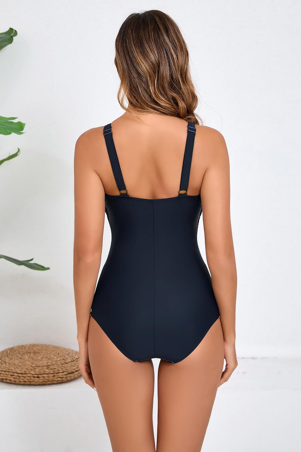 Women’s V Neck One Piece Swimsuit Adjustable Straps Tummy Control Swimming Modest Bathing Suits