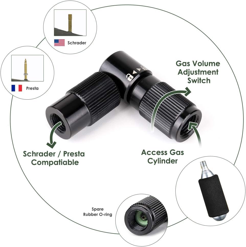 Universal Compatibility — The Inflator head was designed for all threaded CO2 cartridges of 12/16/20/25g(not included). And the other head of this CO2 inflator is compatible for both Presta and Schrader valves, perfect for road, mountain and city bike tires.